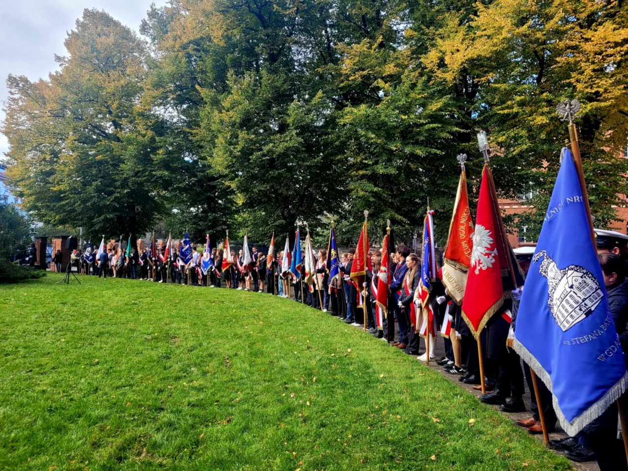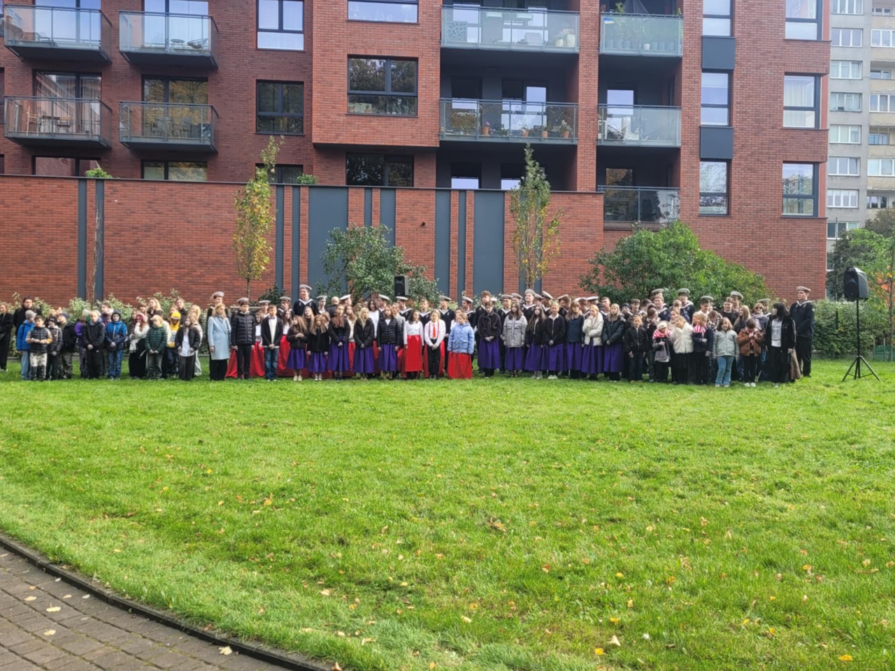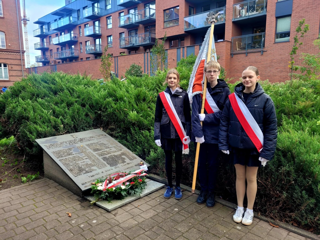 Poczet Sztandarowy w składzie: Milena Smolińska z kl. 8a, Hanna Kujałowicz z kl. 8b oraz Maksymilian Cieciuch z kl. 8c reprezentował naszą szkołę uroczystościach z okazji Dnia Edukacji Narodowej, która odbyła się w dniu 15 października 2025 roku przy Płycie Pomordowanych Nauczycieli na terenie Pomorza w czasie II wojny światowej.